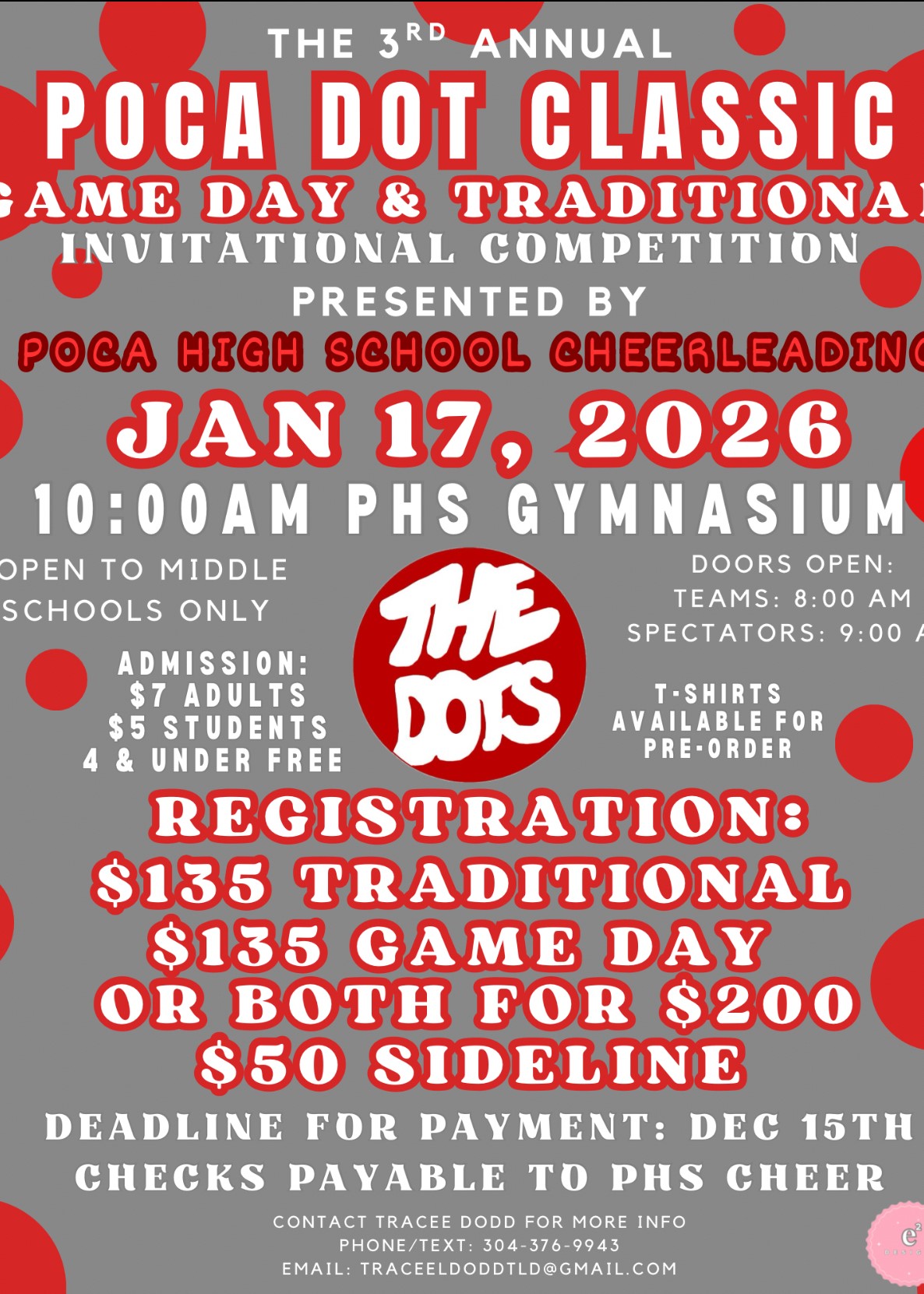 1-10-2026– Chapmanville Cheer Championship–MS & HS welcome. Game Day Routine, Traditional Routine, Stunt Competition, Jump Competition, Coaches Jump Competition. January 10th at 10:00am. Doors open at 9:00am. Warm ups start at 9:00am in the Aux Gym. Team Entry Fees: Game Day $125.00- Traditional- $125.00- Floor Cheer Only- $75.00- Stunt Competition- $10.00 per jumper- Coach jump Competition – $10.00 Admission Fee $10 per person.